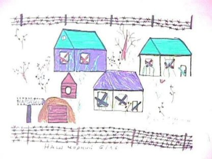 Een kindertekening met daarop de achtergelaten huizen