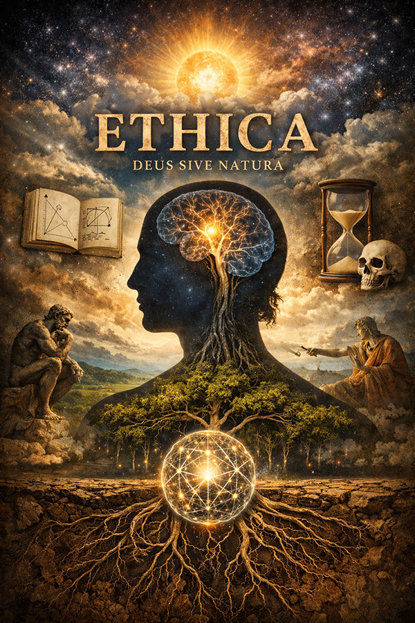 maar hier volledig deel van uitmaakt. Spinoza’s Ethica is revolutionair omdat het religie, natuur, mens en moraliteit volledig rationeel en logisch probeert op te bouwen. De boodschap is dat vrijheid en geluk voortkomen uit rationeel inzicht en het leven volgens de wetten van de natuur.