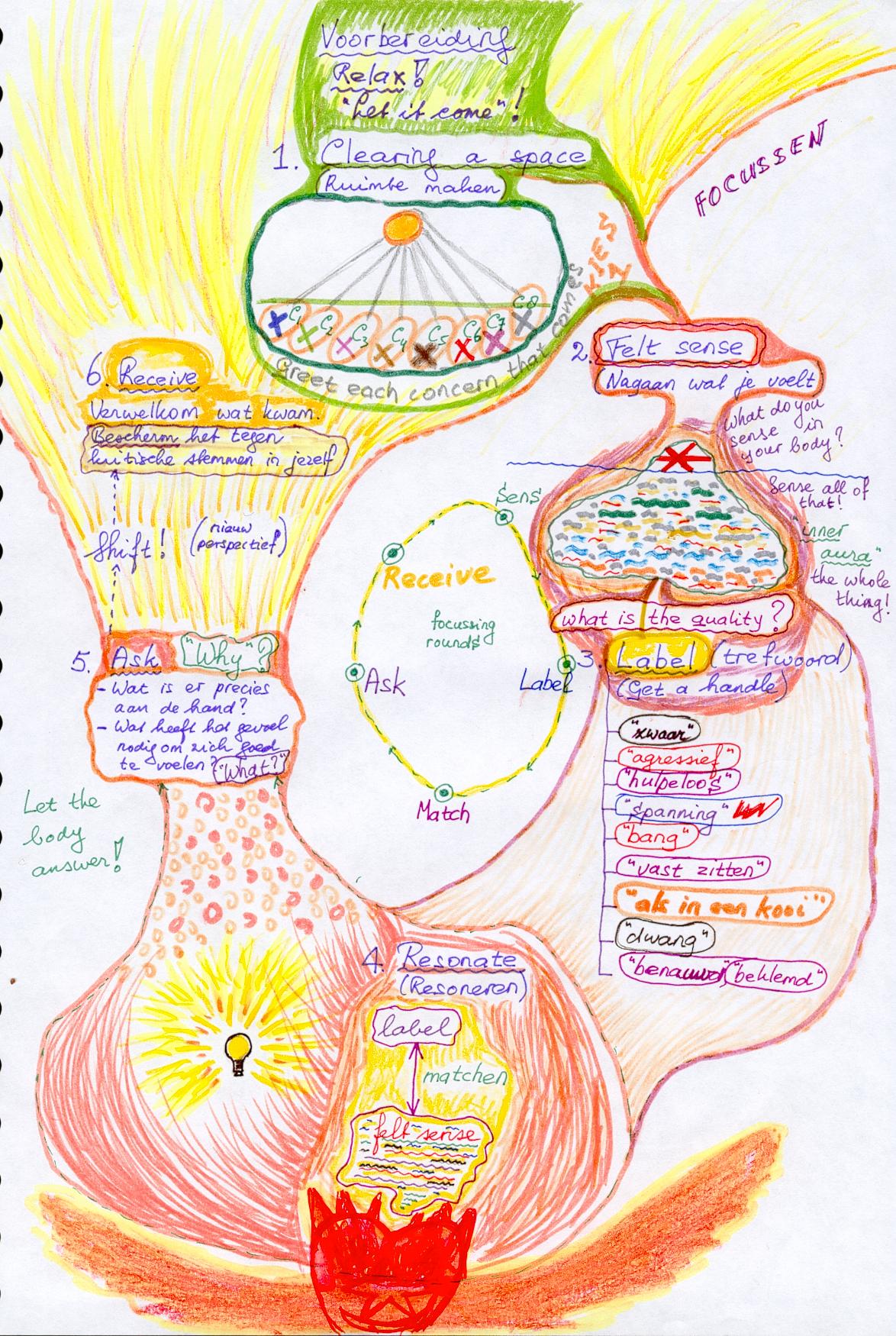 Focussen in zes stappenFOCUSING MANUAL 'Focusing' (focussen, inzoomen) is het zich concentreren op een innerlijk gevoel dat je in jezelf oproept volgens een bepaalde methodiek. Over het algemeen is enige oefening nodig; toepassing van deze methode vraagt een houding die gericht is op zelfobservatie. Hierna zijn de zes stappen van het focussen weergegeven in de vorm van een soort handleiding. Vooraf: De voorbereiding NB: Je zou ook kunnen zeggen: ga in meditatie, maar dan nu volgens een bepaalde strategie. Richt je aandacht zoals gebruikelijk eerst op het waarnemen van de adem. Ga wanneer je tot rust bent gekomen (wanneer je ademhaling rustig en regelmatig is) naar stap 1. 1. Ruimte maken (Clearing a space)Deze eerste stap bij 'focusing' gaat in essentie hierom: maak in je innerlijk een ruimte, en trek door die ruimte een denkbeeldige streep; stel je observerende 'zelf' op aan de ene kant van de fictieve streep, en zet de dingen die je zorgen baren aan de andere kant van de streep. Je observerende 'zelf' registreert van enige afstand alles dat zich als onprettig, verwarrend, problematisch aandient, en zet dit op een rijtje aan de andere kant van de streep. Ieder heeft in zijn of haar leven wel een rijtje problemen dat je met je meedraagt. Niet al die problemen zijn op een bepaald moment actueel. Het gaat er nu niet om alle mogelijke problemen te inventariseren; het gaat er om de probleemgebieden omhoog te krijgen die je nu bezighouden. Stel jezelf de vragen: Hoe voel ik me nu? Waarom voel ik me niet echt goed? Wat houdt mij eigenlijk bezig, wat baart me zorgen? Blijf met je aandacht naar binnen gericht, naar het inwendige van je lichaam, misschien naar je borst of buik. Ga na wat daar gebeurt als reactie op de gestelde vragen. Tast, voel je lichaam (Sense within your body). Blijf rustig zitten, probeer je denken los te laten, en wacht terwijl je contact houdt met je gevoel. Laat de antwoorden langzaam komen vanuit dit contact met je innerlijke bron, je innerlijk voelen. GA NIET IN OP DE PROBLEMEN, observeer alleen dat ze zich aandienen, en zet ze op een rijtje. Blijf ontspannen, kijk alleen, observeer. Blijf je op je gemak voelen. Observeer het, doe een stapje terug, zeg: "Ja, dat is er. Ik voel dit, daar". Creëer een beetje ruimte tussen jou en dat gevoel. Vraag dan wat je nog meer voelt. Wacht op andere gevoelens die opkomen (sense). Meestal is er niet één ding maar zijn er verschillende dingen die omhoog komen. Ga na wat datgene is waardoor je je niet zo prettig voelt. 2. Gevoelde gewaarwordingen (felt sense of the problem) ;Stel jezelf dan de vragen: Waar heb ik nou het meeste last van?